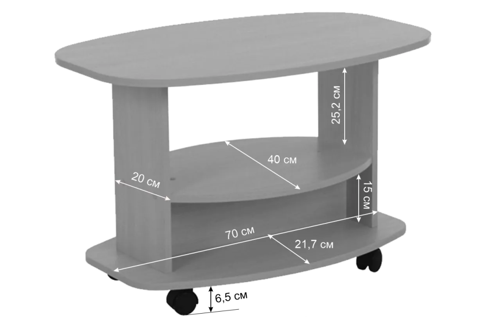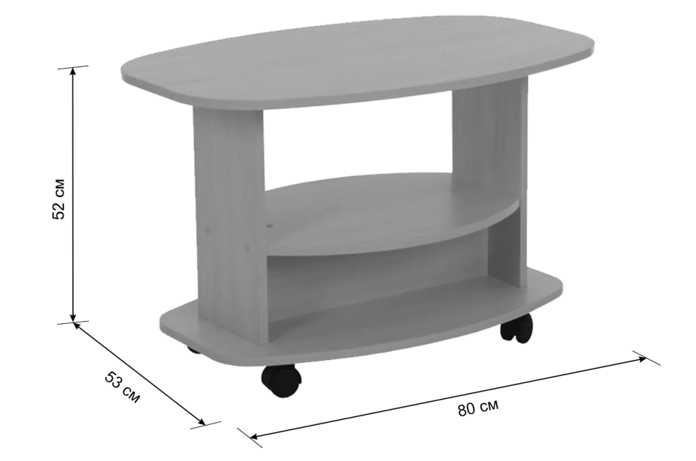 Благодаря колесам, стол легко перемещается по комнате. Дополнительная полка предоставляет удобное место для хранения журналов и газет. Симметричный дизайн гарантирует, что он станет гармоничным элементом в любом пространстве.