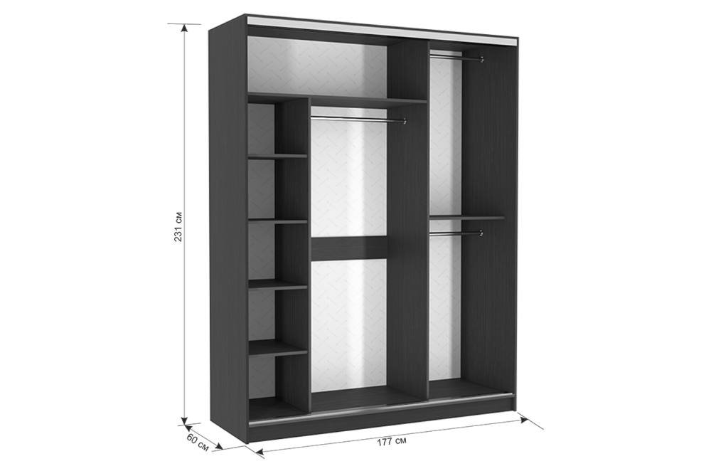 Состоит из: 2-х отделений со штангами для одежды, полок, верхних отделений для крупногабаритных вещей.