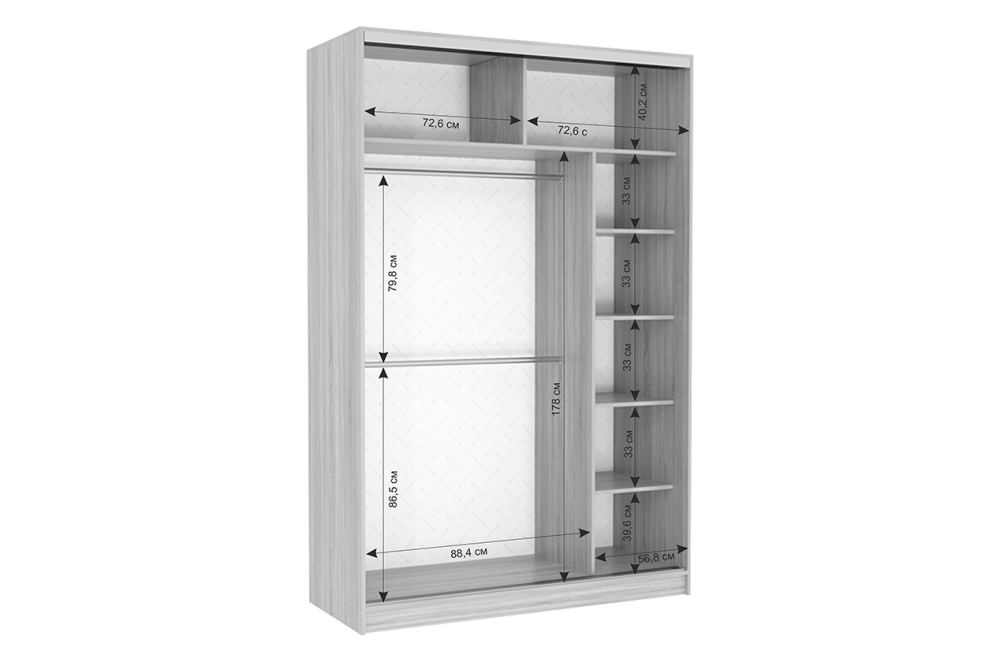 Состоит из: отделение со штангами для одежды, полок, верхних отделений для крупногабаритных вещей. Сборка на одну сторону (полки справа).
